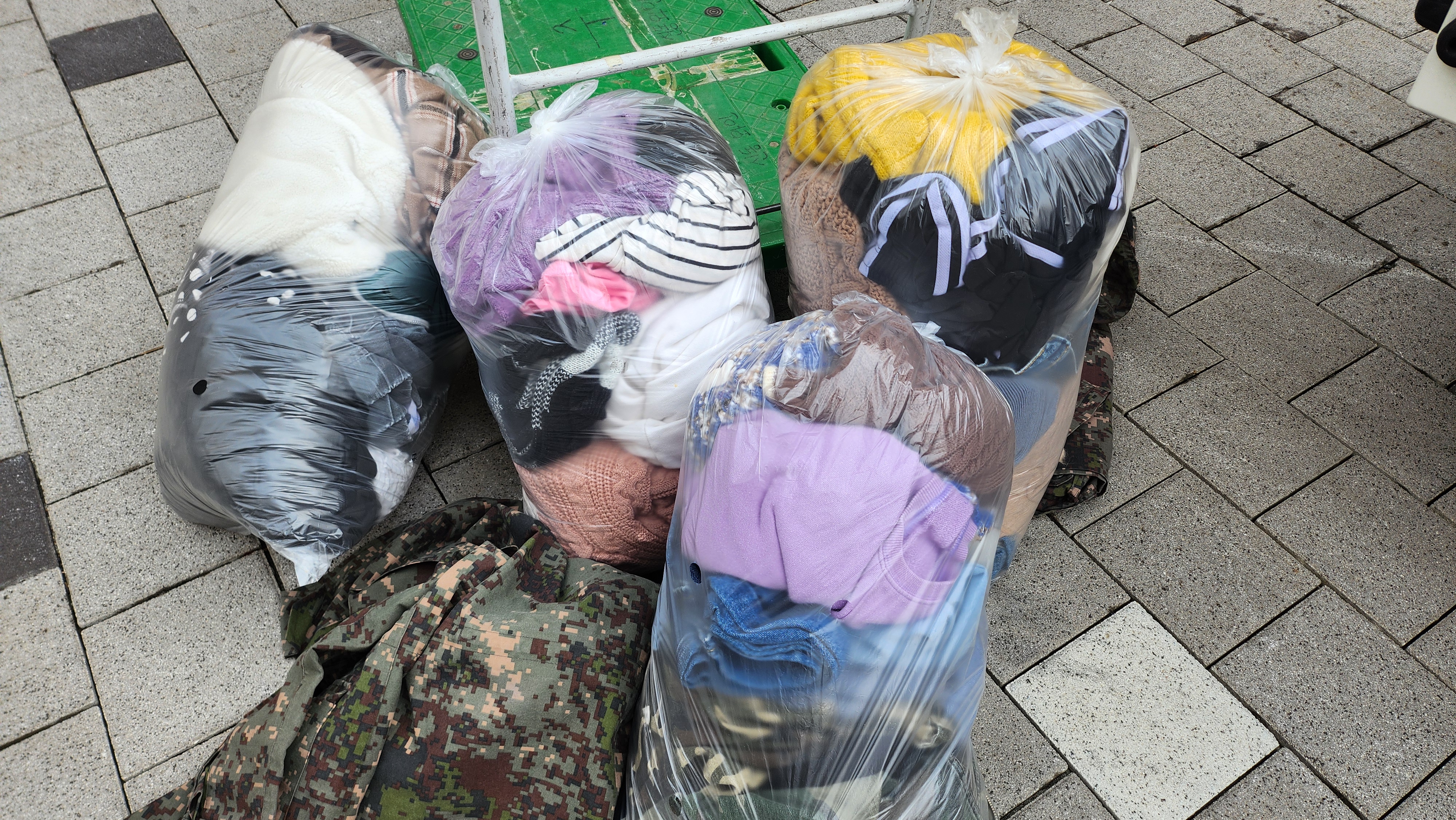 문 앞에 큰 봉투 7개가 가지런히 놓여 있었는데, 봄·가을용 자켓, 여름 티셔츠, 청바지, 원피스 등 다양한 계절 옷이 섞여 있었습니다. 일부는 거의 새것처럼 보였고, 일부는 사용감이 있었지만 재활용에 문제 없는 상태였습니다.